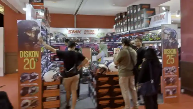 Salah satu peserta pameran yang menjual berbagai helm Studds dan SMK, berikan diskon sebanyak 20% pada beberapa modelnya, sepanjang pameran IIMS 2025.