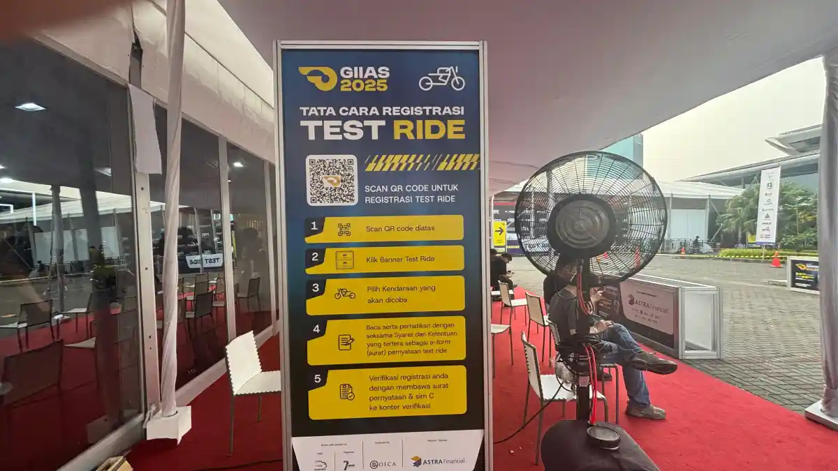 Area test ride motor GIIAS 2025 berlokasi di luar Hall 10–11 ICE BSD, dilengkapi lintasan khusus dan pengawasan ketat untuk memastikan keselamatan. Pengunjung hanya perlu membawa SIM C yang masih berlaku, menggunakan helm, dan mendaftar di lokasi atau melalui aplikasi Auto360.
