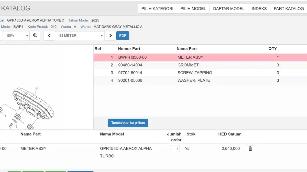 Tingginya rasa penasaran pengguna terhadap fitur ini juga dibarengi dengan pertanyaan mengenai harga panel instrumen Aerox Alpha Turbo. Berdasarkan penelusuran redaksi di aplikasi resmi Yamaha Parts Catalogue, panel instrumen ini memiliki nama resmi Meter Assy dengan kode part BWP-H3500-00.