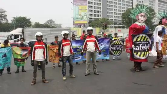 Dengan ditemani atraksi Ondel-Ondel dan alunan musik Gambang Kromong yang ceria khas Betawi, 100 orang Sahabat Satu Hati menyebar melakukan kampanye safety riding secara simpatik di jalur padat kendaraan bermotor di jalan Perintis Kemerdekaan, Jakarta Utara (24/10).