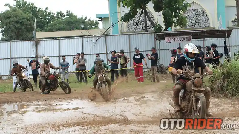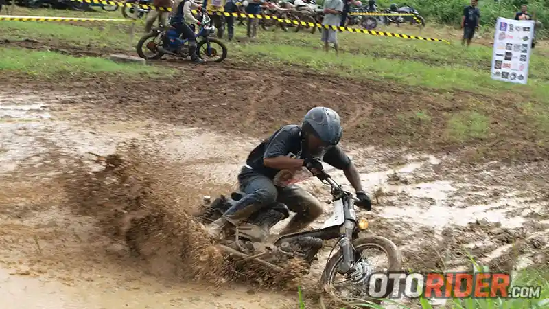 “Pokoknya tenaga motor saya peras pol. Ternyata asyik, macam kompetisi beneran. Gas pol memacu adrenalin di sirkuit berlumpur dengan motor bebek custom dan ban standar pula,” ungkap Sony yang ternyata punya background seorang dragbiker. Hem pantesan doyan bejek gas. Seru! (otorider.com)