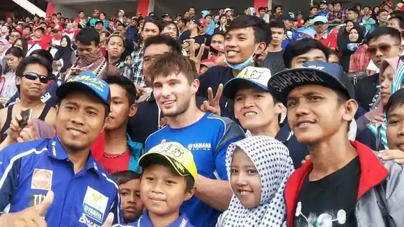Rider Yamaha Indonesia pabrikan dan satelit sangat senang bisa ada di tengah-tengah crowd ratusan orang pendukung Yamaha di tribun penonton.