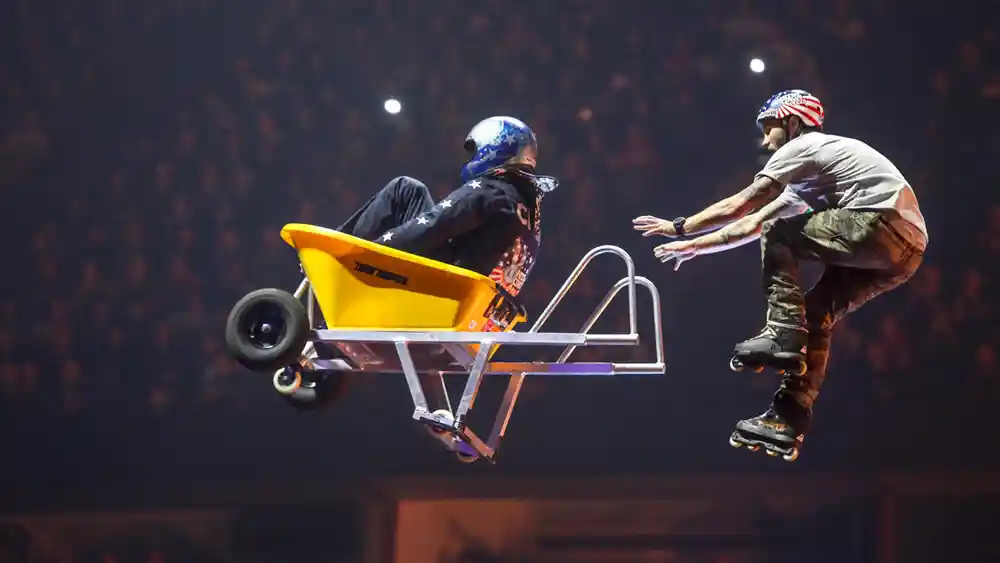 Salah satu atraksi andalannya adalah melompat dari ramps raksasa setinggi 16 meter menggunakan kursi roda, ski, bathtube, troly, hingga menggunakan kotak pendingin minuman.