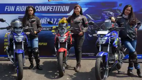 Tiga wanita pencinta Yamaha Vixion, Dhiaz Nivana, Risma Trutus, Anisa Zulva Mirazqi Januar ikut meramaikan gelaran Yamaha Sunday Race seri ketiga dengan mengikuti victory lap di sirkuit Sentul.