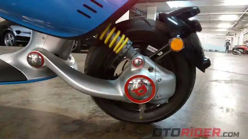 Secara dimensi, skuter listrik Benelli Divo ini terbilang cukup kecil. Bagian belakang juga disuguhkan sebuah penggerak listrik yang terlihat seperti mono-arm. Mono-arm ini terhubung dengan suspensi tunggal di sebelah kiri motor.
