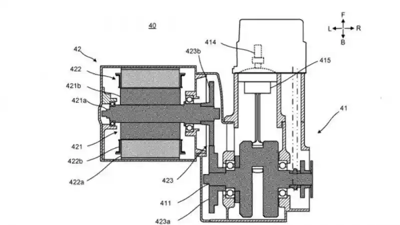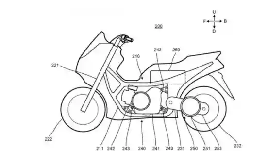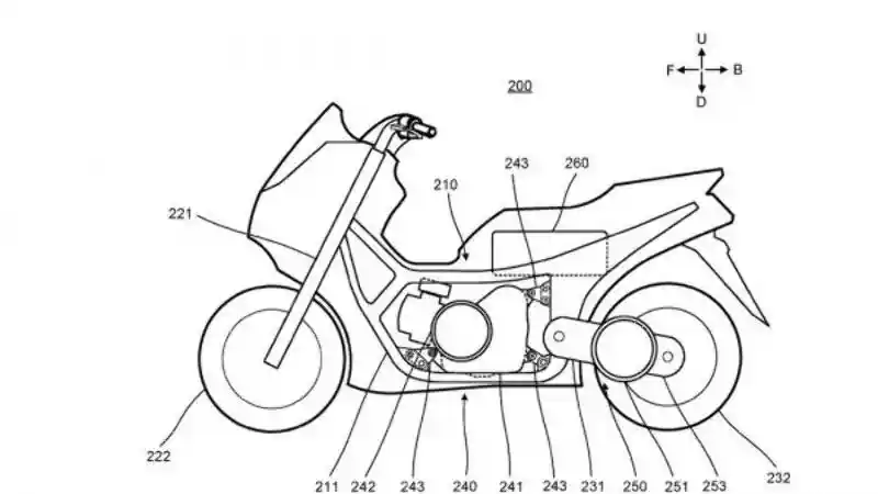 Kemudian dalam paten kedua, Yamaha membuat sistem penggerak hybrid dipasangkan ke lengan ayun dan sistem transmisi motor. Sementara mesin bebas dibiarkan cukup standar dalam gamber paten ini. Di sisi lain, transmisi dan swingarm harus diperbarui secara signifikan untuk menerima penggerak hybrid.