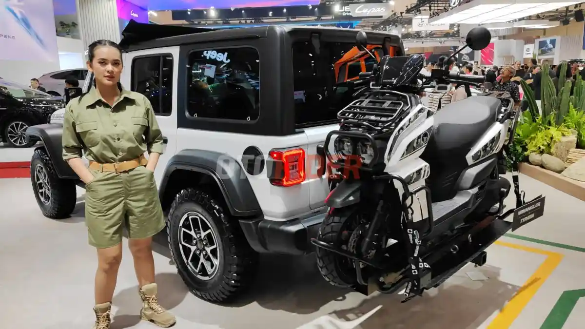 Namun bukan dengan membuka booth khusus, melainkan menjadi display 'gendong' di mobil Jeep. Ternyata bukan sekadar pajangan, karena motor listrik berkonsep skuter dual purpose ini juga dijual di sini.