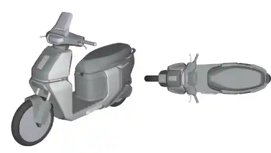 Gambar paten tersebut menunjukkan skuter listrik berdesain modern yang belum pernah dijual secara resmi, baik di India maupun Indonesia.