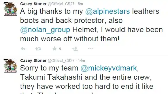 Akibatnya, Stoner tak bisa meneruskan lomba yang masih panjang itu. Pada akun Twitter pribadinya, Stoner diketahui patah tibia (tulang kaki) kiri dan belikat di pundak kiri retak. Honda CBR1000RR andalannya pun rusak parah. Masih dari akun Twitter pribadi Stoner, rider 30 tahun ini mengucapkan permintaan maaf pada Takumi Takahashi dan Michael Van Der Mark, rekan setimnya. Tak lupa ia juga mengucapkan terima kasih pada sponsor dan tim tempat ia bernaung, MuSASHi RT HARC-PRO. (otorider.com)