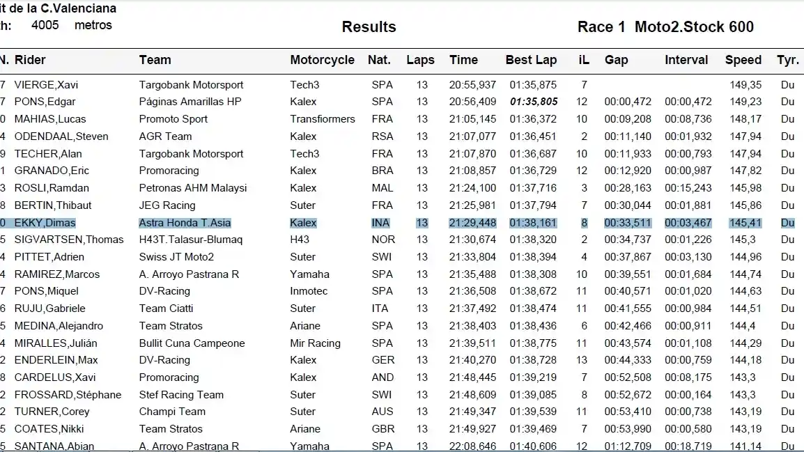 Dimas Ekky yang tampil di seri ke tujuh CEV Moto2 berhasil finish di urutan kesembilan. Seri Valencia ini yang sekaligus jadi seri terakhir CEV Moto2 tahun ini dimenangkan oleh Xavi Vierge yang menggeber Kalex. Sementara pencapaian Dimas yang finish di posisi sembilan menjadi pemenuhan target pembalap yang bernaung di Astra Honda Team Asia ini.