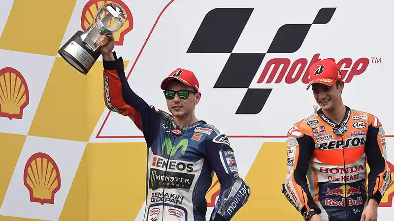Lorenzo Acungkan Jempol Terbalik Saat Rossi Angkat Piala di MotoGP Sepang