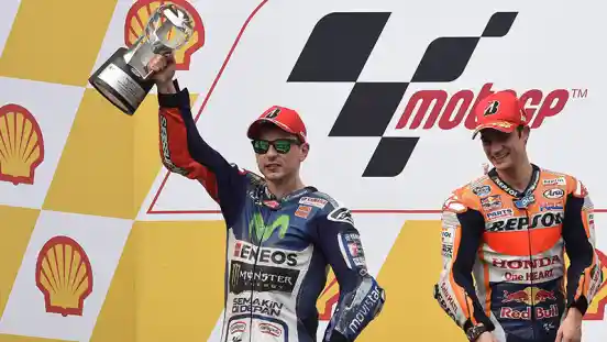 Kekesalan Jorge Lorenzo akan ulah Valentino Rossi yang dianggap menjatuhkan rekan senegaranya, Marc Marquez diluapkannya dengan aksi di podium.