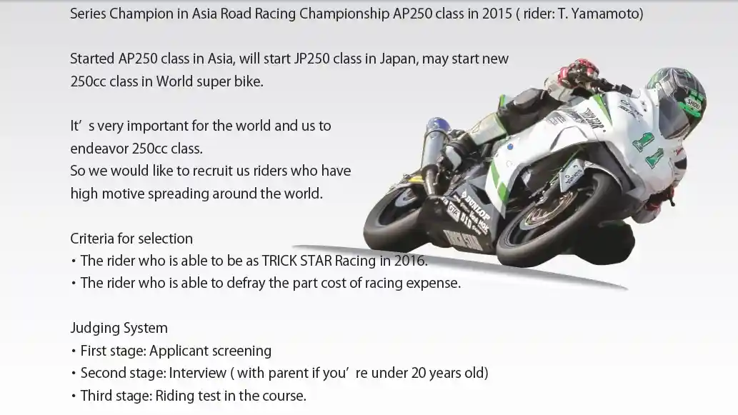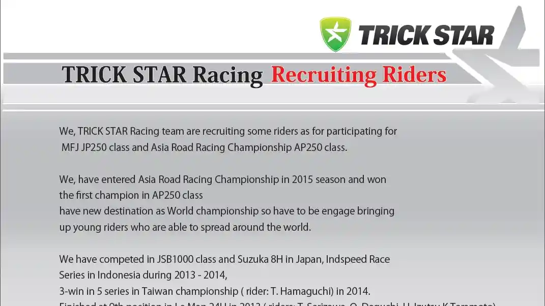 Trick Star Racing yang jadi tim jawara di ARRC 2015 sedang mencari pembalap baru. Hal tersebut diketahui dari iklan yang dirilis oleh tim asal Jepang tersebut. Dalam iklan tersebut disebutkan bahwa Trick Star Racing membutuhkan pembalap untuk bertarung di kelas 250 cc.