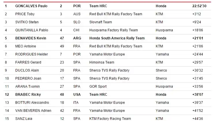 Sementara Husqvarna Factory Rally Team belum bisa naik ke peringkat tiga besar. Melalui Pablo Quintanilla, Husqy masih berada di peringkat keempat.