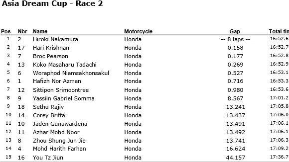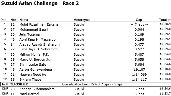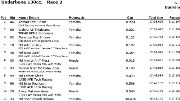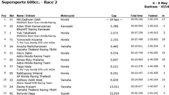 Berbeda dari hasil race-1 di mana tiga pembalap Indonesia mampu menjadi juara di tiga kelas berbeda. Maka di race-2 hari ini (8/5), pembalap Malaysia yang mendominasi.