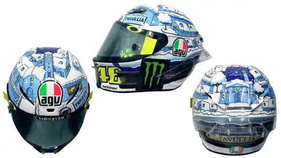 Tetapi, berbeda dengan grafis helm tahun lalu yang menampilkan grafis Snowman, atau manusia salju, maka grafis helm musim ini lebih dekat dengan Rossi.