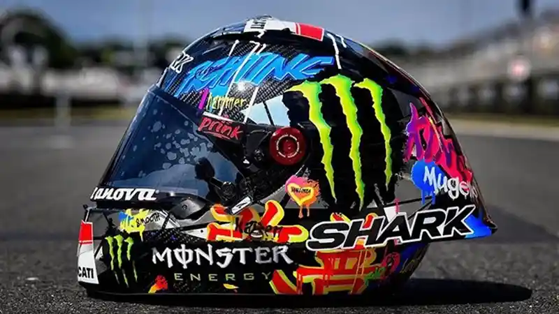 Helm yang digunakan pembalap Ducati ini mengusung merek Shark, dan beberapa grafis Monster Energy.