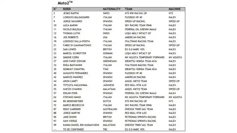 Sementara itu, Johann Zarco justru tak terdaftar di tim manapun. Di tim Avintia Ducati, yang menawarkannya bergabung, justru masih diisi oleh Karel Abraham dan Tito Rabat. Kabar lain menyebutkan, Zarco akan turun takhta kembali ke kejuaraan Moto2 pada musim depan.