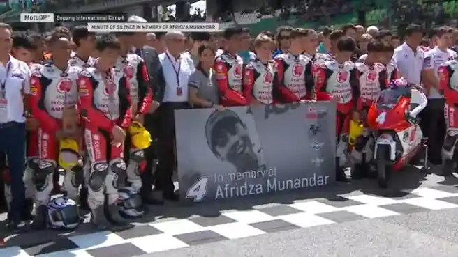 "Seluruh insan MotoGP, FIM dan Dorna Sport turut mengucapkan rasa duka cita mendalam untuk keluarga dan teman-teman Afridza Munandar," ujar pembawa acara pada momen yang digelar di garis start Sepang itu.