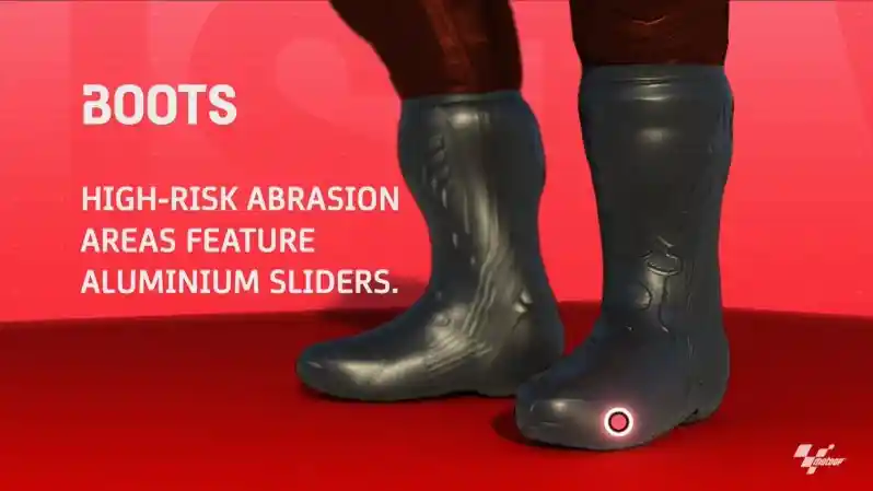 Bagian kaki juga harus dilindungi oleh sepatu boots yang sangat kuat. Disebutkan sepatu boots harus lebih kuat tiga kali lipat daripada sarung tangan. Bahkan untuk menghindari abrasi, dibagian ujungnya diletakan alumunium sliders.