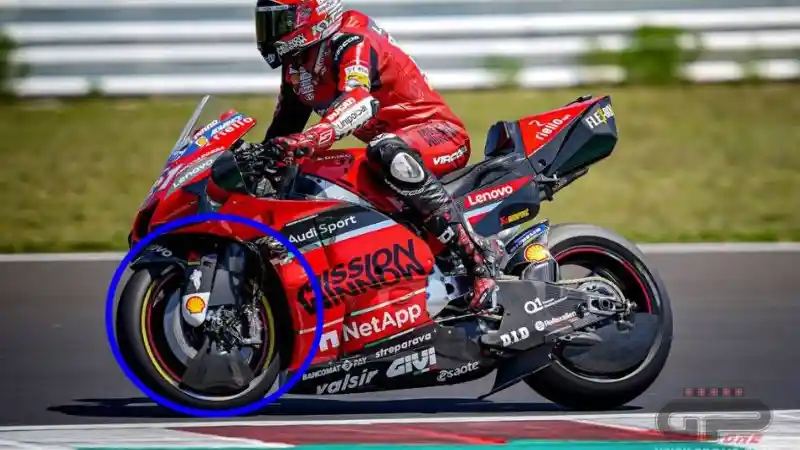 Ducati pun melakukannya pada beberapa detail komponen kecilnya, seperti di bagian suspensi depan. Pada motor Desmosedici tersebut terlihat adanya mini-cover guna memaksimalkan fungsi aerodinamis motor.