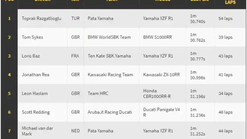 Dau hari tes secara berturut-turut, ia mampu membawa CBR-nya konsisten bertengger di posisi kelima. Waktu tempuh terbaiknya adalah 1 menit 30,882 detik masih kalah dari Yamaha YZF R1 besutan Toprak Razgatlioglu yang masuk urutan 4 terkencang (1 menit 30,752 detik).