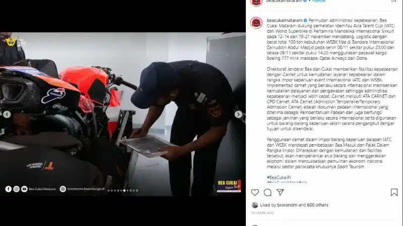 "Direktorat Jenderal Bea dan Cukai memberikan fasilitas kepabeanan dengan Carnet untuk kemudahan layanan kepabeanan dalam rangka impor keperluan event Internasional IATC dan WSBK. Implementasi carnet yang berlaku secara internasional memberikan kemudahan pelayanan dan pengawasan sehingga administrasi kepabeanan menjadi lebih cepat," tulis kepsyen Instagram @beacukaimataram.