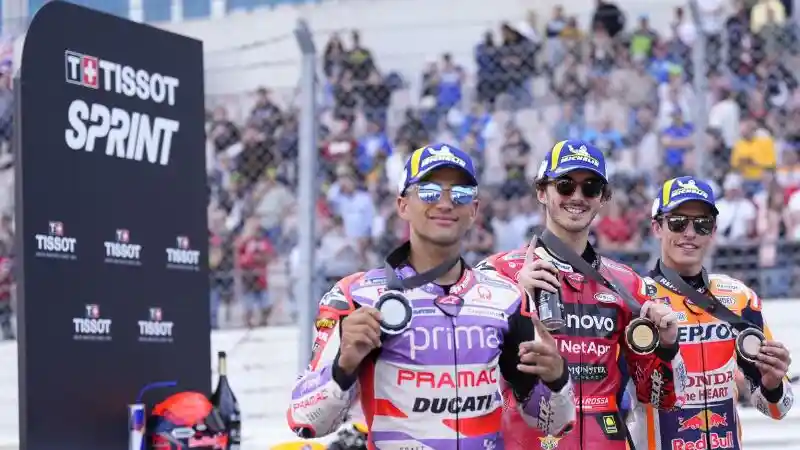 Bagnaia mencatatkan waktu 19 menit 52,862 detik saat menjuarai edisi perdana Sprint Race MotoGP 2023. Pembalap bernomor 1 itu unggul tipis dari Martin dan Marquez, yaitu hanya terpaut waktu 0,307 detik dan 1,517 detik.