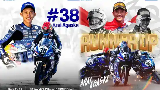 OTORIDER – Pembalap muda Indonesia, Arai Agaska, menutup musim 2025 dengan hasil membanggakan setelah finis di posisi runner-up klasemen akhir kejuaraan R3 bLU cRU World Cup 2025.