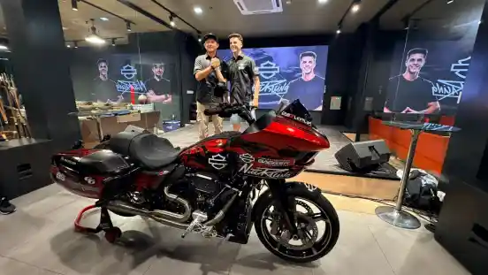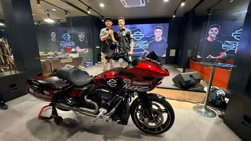 Keduanya akan menggeber Harley-Davidson Road Glide yang tampil agresif dengan dominasi warna merah, livery api, serta sentuhan batik khas Mandalika di bagian depan motor.