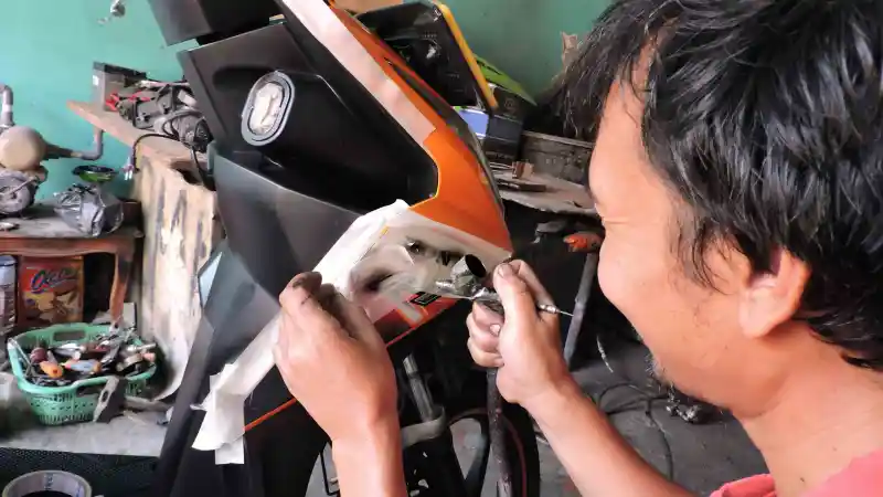 Harga bodi part orisinil semakin mahal, butuh merogoh kocek kian dalam jika mengalami kerusakan parah tidak hanya lecet saja bahkan sampai pecah. Gimana dong solusinya? Nah, Gev’s paint yang berada dikawasan Joglo menyediakan jasa repair bodi untuk semua motor mulai dari matic, bebek, naked bike, motor sport dan lain-lain.