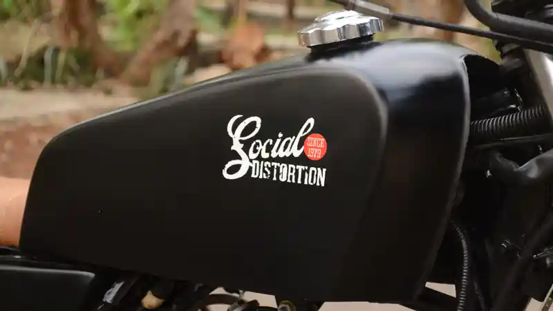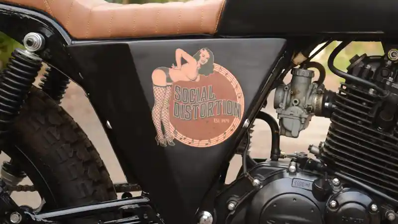Untuk melengkapi tema yang diusung, warna hitam semi doff dipilih. Dan tidak ketinggalan logo band Social Distortion yang merupakan band favorit sang pemilik juga tersemat. Uniknya meskipun terkesan gahar dan ‘laki banget’, namun motor ini spesial untuk sang istri tercinta. (otorider.com)