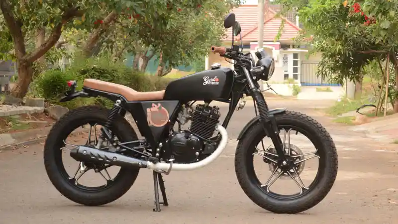Ditangan dingin modifikator yang bermarkas di Cimanggis ini, motor satu silinder asal pabrikan berlambang S itupun dimutilasi. Sasis aslinya dipotong pada bagian tangki sekitar 8 cm lalu bagian bokong juga kena pangkas kurang lebih 20 cm.