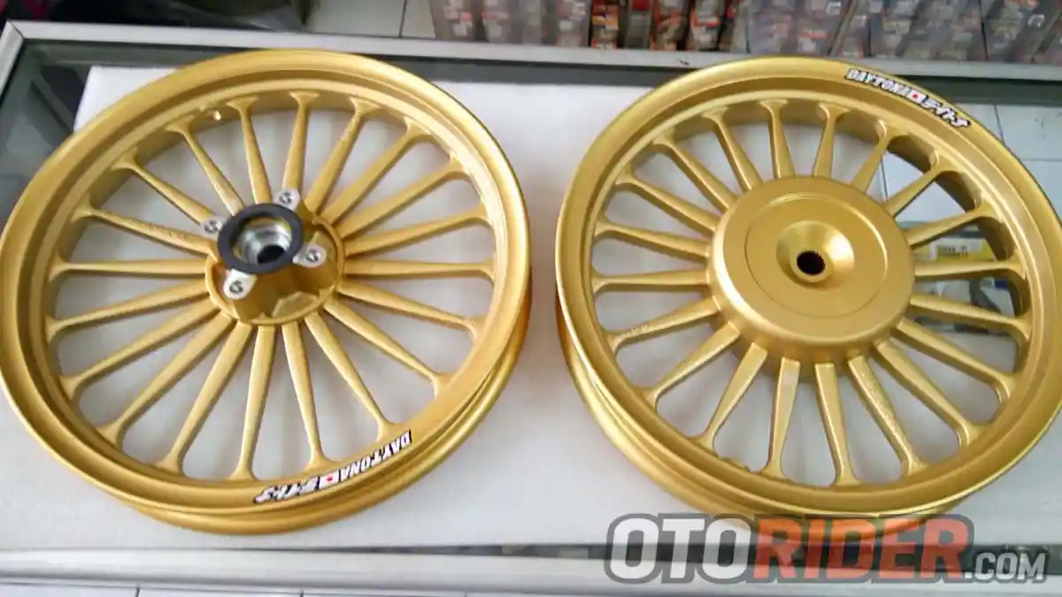 Pertama, Daytona menawarkan pelek berdiameter 14 inci, ukuran depan 14x1.85, belakang 14x2.15, lebih lebar dari standar pabrik. Tersedia dalam warna gold, hitam, dan silver, pelek palang ini dibanderol Rp 2,5 juta.
