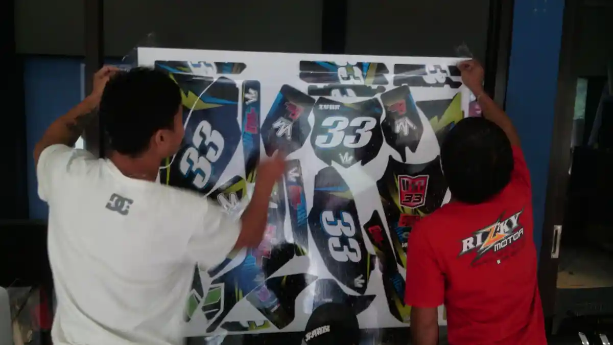 Ngomong-ngomong berapa biaya pesan decal disitu ya?. "Macam-macam kan tergantung design juga. Kan bentuk bodi motornya juga berbeda. Misal Kawasaki KXF akan beda dengan Husqvarna. Pokoknya kisaran Rp 300 ribu sampai Rp 1.5 juta," lanjut pria yang usung nomor 33 di lintasan motocross.