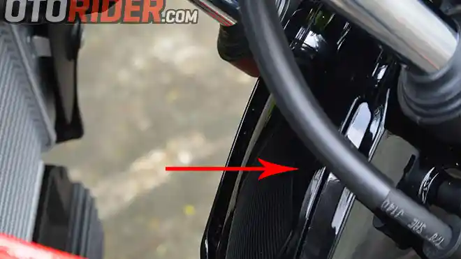 Sedikit beralih ke bawah, ada tutup klakson yang berfungsi untuk menghindari klakson dari cipratan air langsung dan kotoran. Maklum, letaknya agak sedikit di bawah radiator. Sisi kanan bodi juga diberi pelapis anti panas, karena posisi knalpot yang sedikit miring ke kanan.