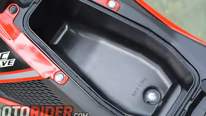 Beralih ke bagian panel underbone, ada tutup reservoir radiator yang tersembunyi di atas bagasi. Nah, pada sasis tengah Satria F150 injeksi ini juga terdapat bagasi mungil yang bisa berfungsi sebagai tempat botol minum, atau handphone.