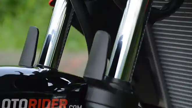 Dari depan, bagian spakbor terdapat sepasang celongan yang berfungsi untuk menyemburkan udara dingin, yang sekaligus membersihkan radiator dari debu. Di bagian suspensi, terdapat sepasang pelindung untuk mencegah benturan dari krikil.