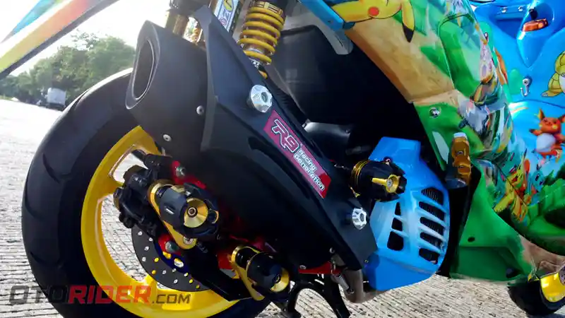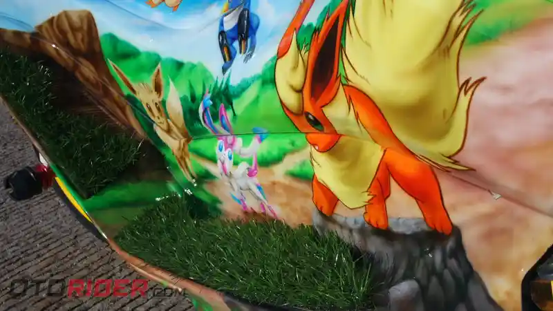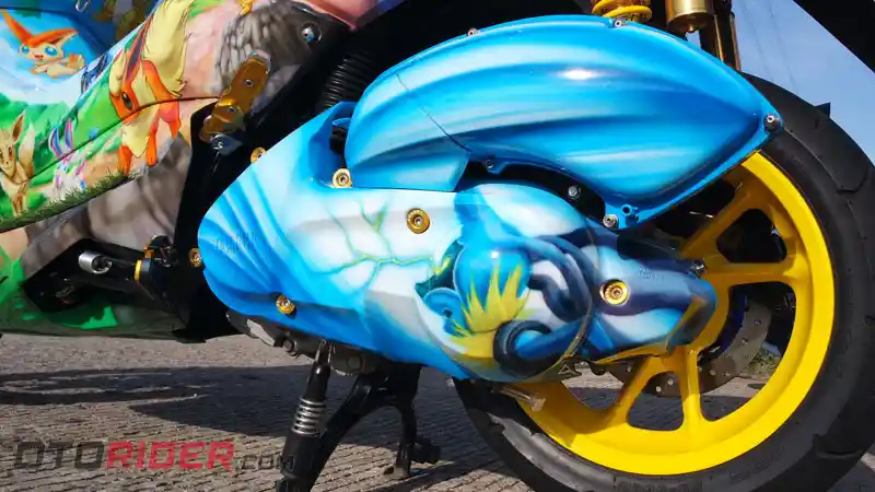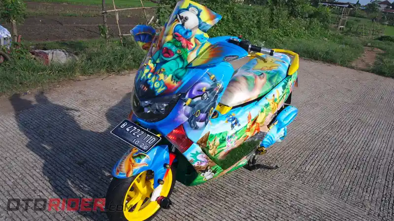 Eits, bukan dengan main Pokemon Go sambil berkendara. Namun, game yang menyajikan monster-monster lucu tersebut justru jadi inspirasi modifikasi motornya. Tak pelak berkat laburan airbrush dari ARM Motor, Jakarta Timur, sekujur bodi NMax kesayangannya dipenuhi tokoh-tokoh animasi dari Pokemon.