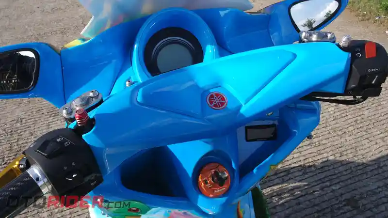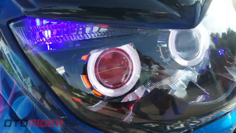 Nggak hanya bermodal bodi airbrush, motor bertransmisi otomatis ini juga dibekali aksesori aftermarket plug and play jadi rujukan. Seperti terlihat di bagian suspensi, knalpot, windshield, cover mesin dan lampu model proyektor dan angel eyes. (otorider.com)