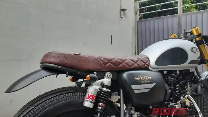 Pada bagian belakang motor ini, tidak ada ubahan yang signifikan. Karena memang basis rangka motor ini sudah cocok untuk untuk modifikasi berkonsep cafe racer. Ubahan hanya dilakukan pada jok dengan motif Diamond. Jok ini sebenarnya tersedia sebagai komponen modifikasi yang disebut Custom Kit khusus W175 ala Katros Garage.