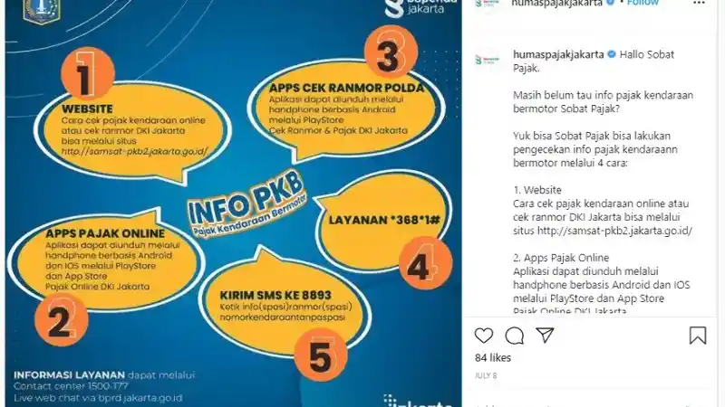 Fitur ini dihadirkan oleh Badan Pendapatan Daerah (Bapenda) yang menghadirkan sejumlah cara untuk mengetahui besaran pajak kendaraan. Berdasarkan akun Instagram @humaspajakjakarta, setidaknya terdapat lima cara yang dapat dilakukan. Tentu kemudahan mengecek tarif PKB tanpa keluar rumah akan sangat memudahkan masyarakat.