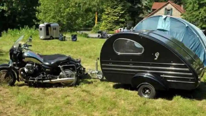 Pertama adalah Moto Guzzi California yang menggunakan gandengan di bagian belakang sebagai camper. Berbentuk sebuah tear drop atau tetesan air, camper ini cukup berkesan karena menggunakan gaya yang mengikuti motor. Dilihat dari ukurannya, tampaknya camper ini bisa memuat dua orang dewasa dengan nyaman.