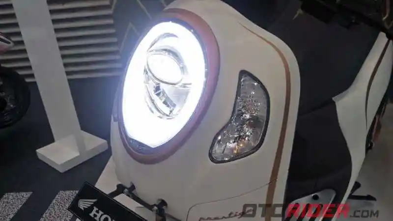 Secara tampilan, motor ini tetap mempertahankan warna Matte White sebagai warna dasarnya. Kelir aksen emas dipasangkan di sejumlah titik, mulai dari aksen di sekitaran lampu dan bodi samping. Selain itu kelir emas juga diwarnai pada bagian pelek, suspensi, windscreen, behel hingga ke aksen chrome di cover knalpot.