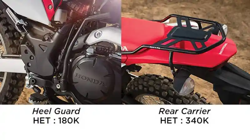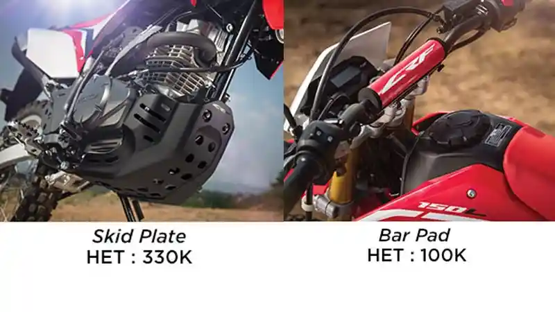 Tercatat, CRF150L memiliki empat pilihan aksesoris resmi yang bisa langsung dipasang alias Plug and Play. Aksesoris tersebut yakni Skid Plate, Bar Pad, Heel Guard, serta Rear Carrier.