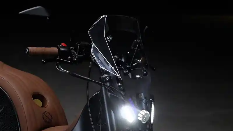 Bagian wind shield diambil dari BMW C400 yang sudah dimodifikasi serta dipadu dengan lampu LED di bawahnya. Selain itu, tersemat pula panel instrumen Motogadget Motoscope Mini di balik fairing-nya.