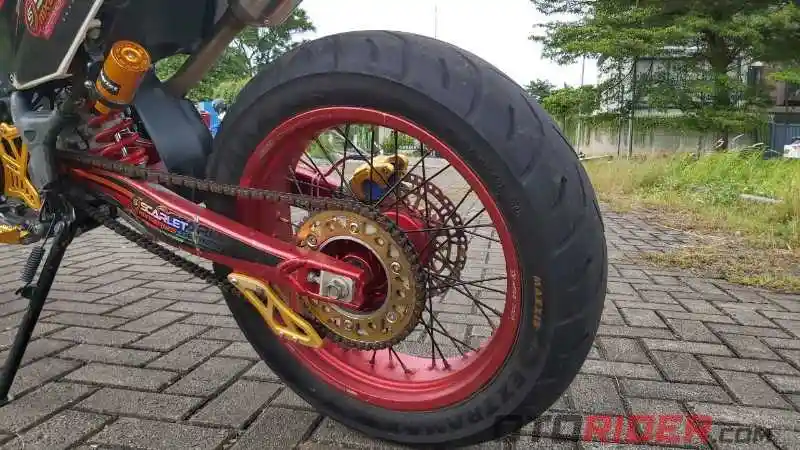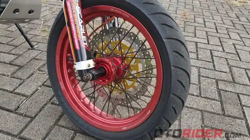 Adrian selaku Tim Research & Design Scarlet menyebutkan untuk modifikasi supermoto banyak mengubah komponen kaki-kaki. Terutama pada bagian suspensi, swing arm, pelek, hingga ban. Adrian mengaku, keseluruhan komponen menggunakan part dari Scarlet.