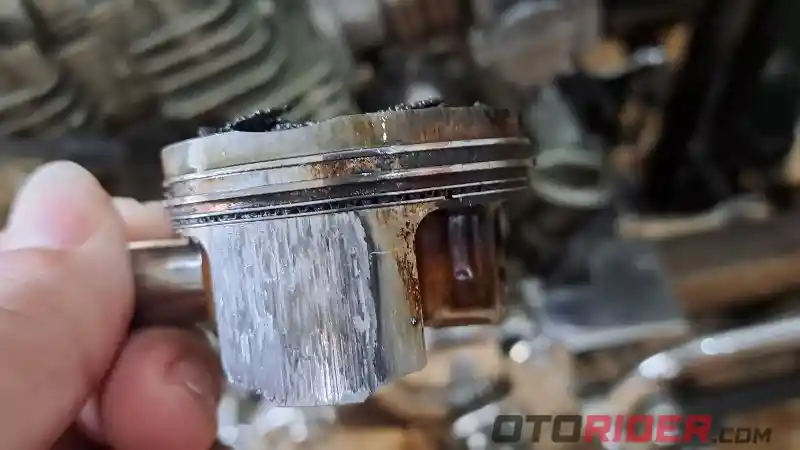 Seperti komponen lain, seiring pemakaian ring piston akan mengalami keausan. Jika sudah mengalami keausan, maka oli mesin tidak bisa tersapu bersih oleh ring piston cacing. “Kalau kondisi ring piston sudah tidak bagus, oli mesin bisa masuk ke ruang bakar dan ikut terbakar. Motor jadi mengeluarkan asap putih dari knalpot,” jelas Erwin.