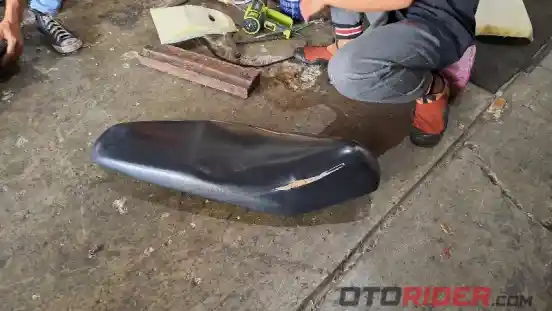"Cara pertama untuk mengakalinya bisa pakai kulit jok yang agak kaku dan tidak berserat. Seperti kulit jok motor tipe Napa Prime dari pabrikan kulit sintetis AP Force,” ujar Arie saat ditemui OtoRider di Kawasan Cibubur, Jakarta Timur.
